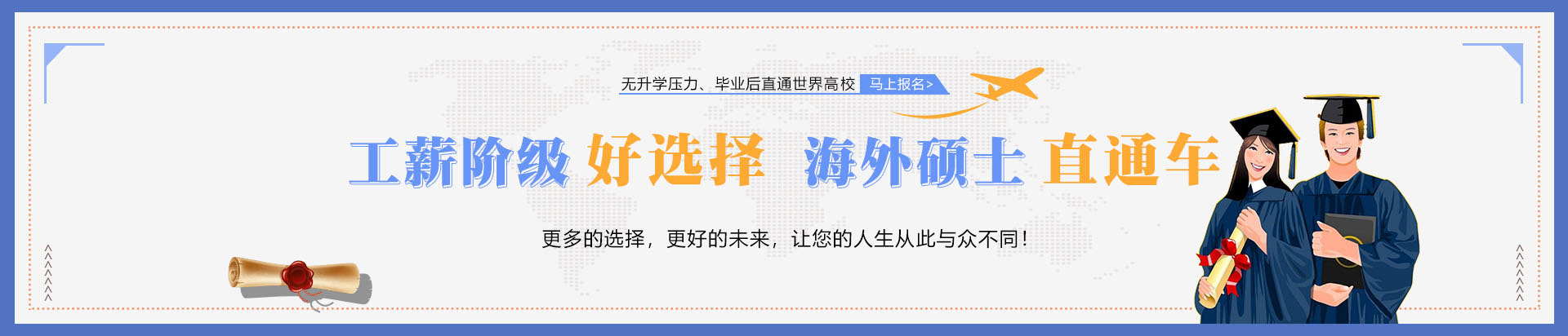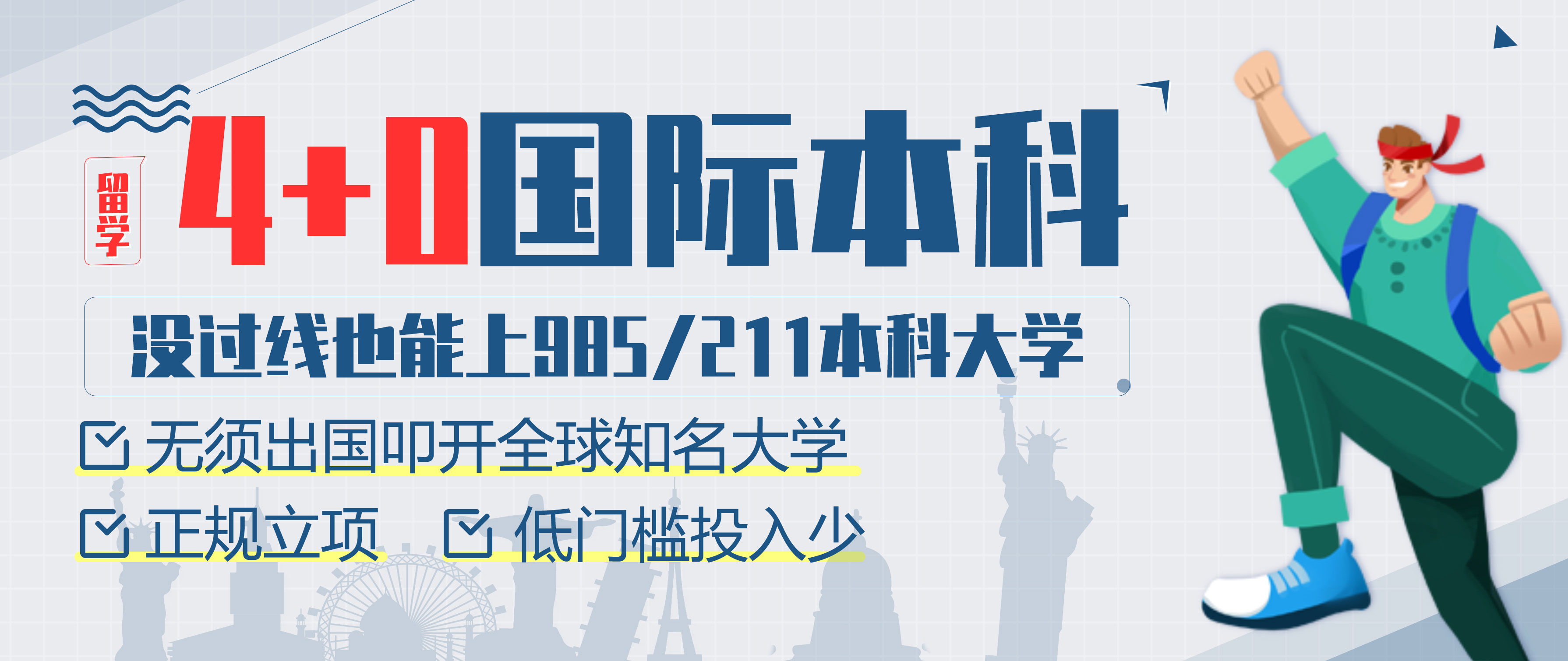 每年高考后都有超过几百万的考生无法就读国内本科。是这些考生真的达不到本科的能力要求吗?并不是!他们只是缺少一个机会!低分留学方案为学子提供一个读本科的机会... 查看详情 >
