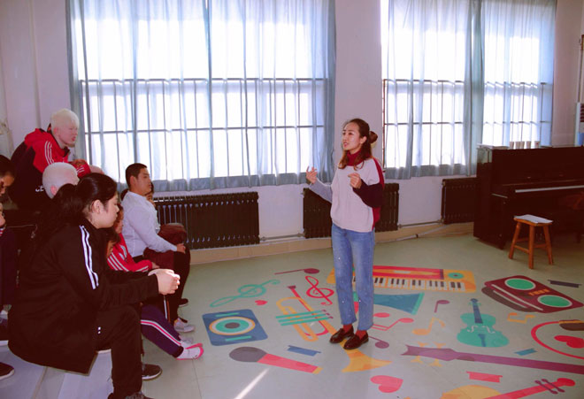 我校高俊磊老师长期在盲校进行志愿服务,根据她的经验,志愿者为孩子们带来了平日里喜欢但没有机会接触的民族乐器。