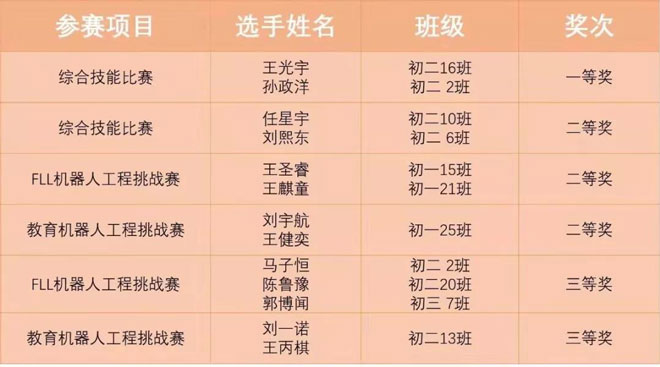 潍坊文华学校共选拔六支队伍参加比赛,在综合技能、教育机器人工程挑战赛、FLL工程挑战赛三项比赛中,取得了一项一等奖、三项二等奖、两项三等奖的优异成绩。