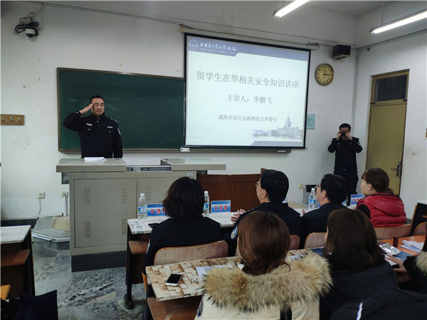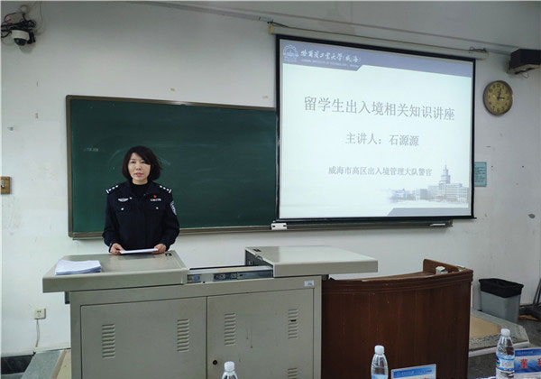 为营造我校良好的法制教育环境与氛围,增强学校推进法制教育的实效性,提高留学生良好法治观念、树立良好的法制意识,3月29日下午,由我校留学生中心、后勤保卫处、威海市高区出入境管理大队、金海滩边防派出所4家单位共同主办的哈工大(威海)第二届留学生法制教育宣讲会在主楼531教室成功举办。哈工大(威海)全体留学生、语言班教师代表、留学生管理干部等80余人参加活动。国际合作处副处长兼留学生中心副主任董科,后勤保卫处安全保卫办公室王丽波,威海市高区出入境大队大队长王宏家、警官石源源,威海市高区金海滩派出所警官李鹏飞出席本次大会。