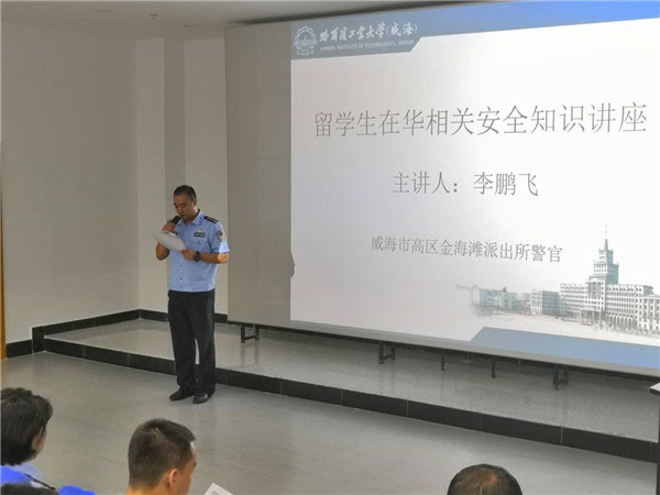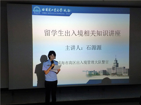 9月6日下午,由校区留学生中心、后勤保卫处、威海市高区出入境管理大队、金海滩边防派出所4家单位共同主办的2019年秋季哈工大(威海)国际学生安全教育大会在图书馆五楼影视厅成功举办。出入境管理大队大队长王宏佳、校团委书记胡韬、国际合作处处长助理路怀宇、后勤保卫处学生公寓管理办公室副主任尹小鹏出席活动。金海滩派出所民警、图书馆多媒体负责教师、计算机学院辅导员、劲松书院学生干部、学生社团负责人,以及留学生中心师生全体60余人在座。