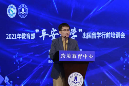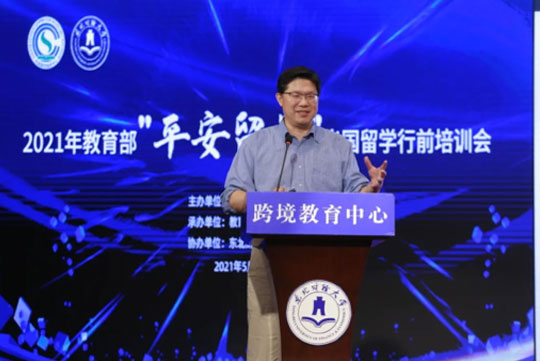 5月21日,由教育部国际合作与交流司主办、教育部留学服务中心承办、东北财经大学协办的2021年教育部“平安留学”出国留学行前培训会在我校科学报告厅成功举办。中共大连市委党校教授杨青山、教育部平安留学首席心理专家李同归、外交部领事司调研员陈一帆、现场安全培训高级教官陈天宇、德威安保中心教官史越、英国文化教育协会雅思口语考官Anthony Newton等专家进行主题讲座。会议由东北财经大学跨境教育中心副主任韩亮主持。东北财经大学党委常委党委宣传部部长盛云,跨境教育中心主任丁晓玉及200余名东北财经大学本科生、研究生参会。