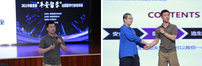 现场安全培训高级教官陈天宇、 史越向与会人员强调了留学在外树立安全意识的重要性,随后讲解了枪击、火灾等突发性事件的应对方法,现场演示了留学安全实操训练,并邀请了部分代表上台互动,提醒在场学员身在异国,要充分利用当地资源,真正落实“平安留学”理念。