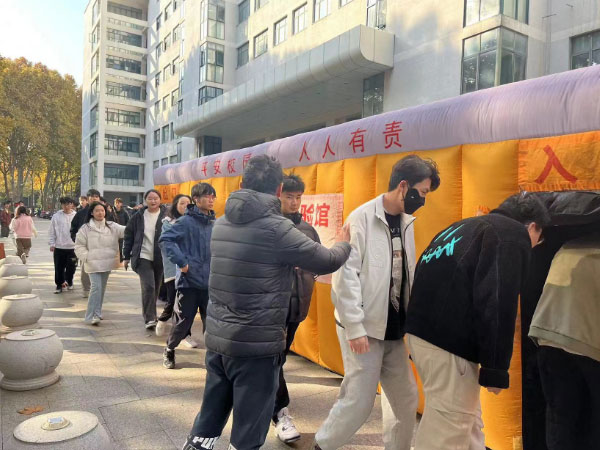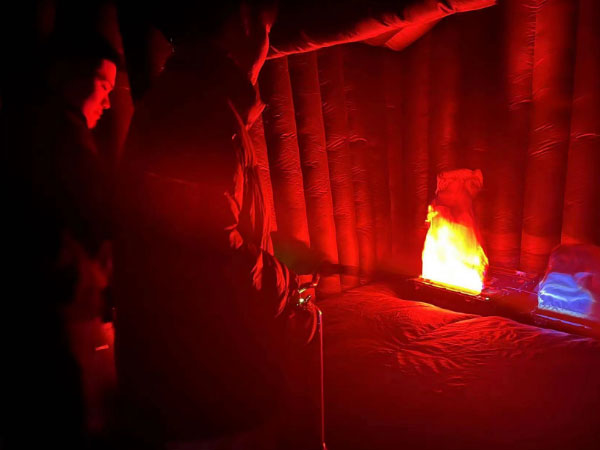 在实操演练环节,同学们进行了模拟灭火和烟雾逃生的体验。在帐篷模拟火灾现场,师生们在一片漆黑、浓烟滚滚的环境中按照指导,有序地通过了演练帐篷,实践在火灾中保持冷静、寻找安全出口、迅速撤离火场的基本技巧。在模拟灭火环节,消防安全员现场操作示范,引导同学们逐一操作使用灭火器,成功扑灭了模拟火焰。