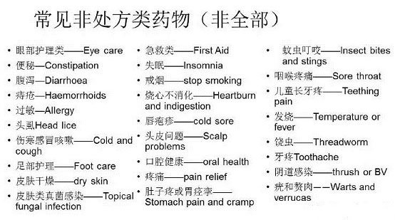 上述这些非处方药均可在英国药房或超市购买,对那些病因清楚,症状明显和简单的个人健康问题可进行短期缓解,且建议在英国居住的家中常备。当然,英国可以购买的非处方药不仅仅是这些,如下所示。