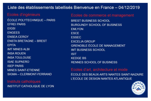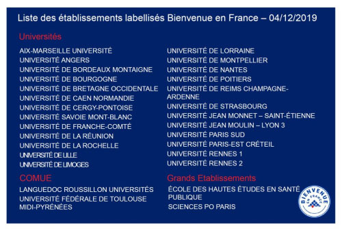 为了改善国际学生的接待质量,法国政府创立了“法国欢迎你”国际学生接待服务认证体系。“法国欢迎你” 认证标志将会颁发给那些为国际学生优接待质量、从本科一年级起便提供英文授课、拥有一站式接待窗口、提供住房以及就业辅助措施的学校。57所法国高校获得“法国欢迎你”认证。