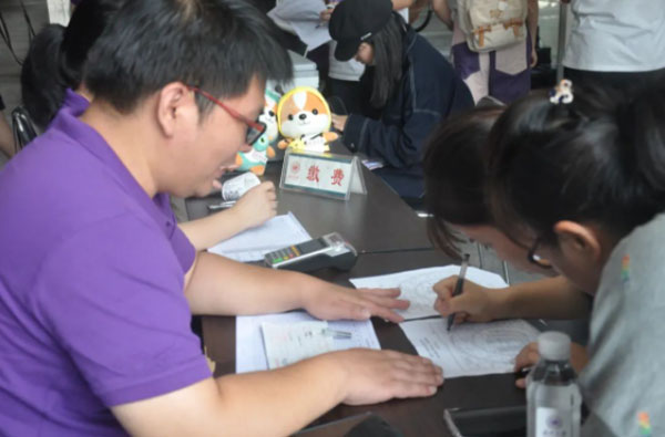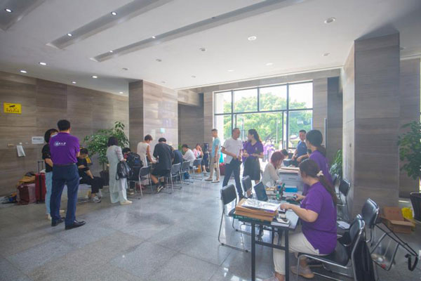 签名打卡完毕后,新同学来到国际楼一楼大厅,开始报到流程,老师们收取材料,核对信息,发放新生大礼包,认真叮嘱,确保每位同学的资料都准确无误。