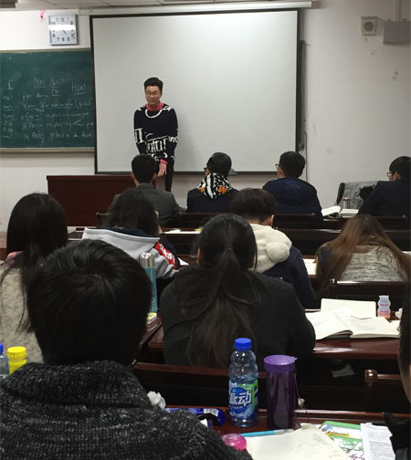 我们老师也很欣慰2013级的学生们目前在国外就读情况良好,也借此机会邀请李元昊同学给今年的新生讲述当年在华师IFC预科班的学习经历并分享了他在澳洲八大高校就读的感想。同学们在听完演讲后,踊跃发言提问。李元昊同学用他幽默有趣的例子解答了各位同学的问题。
