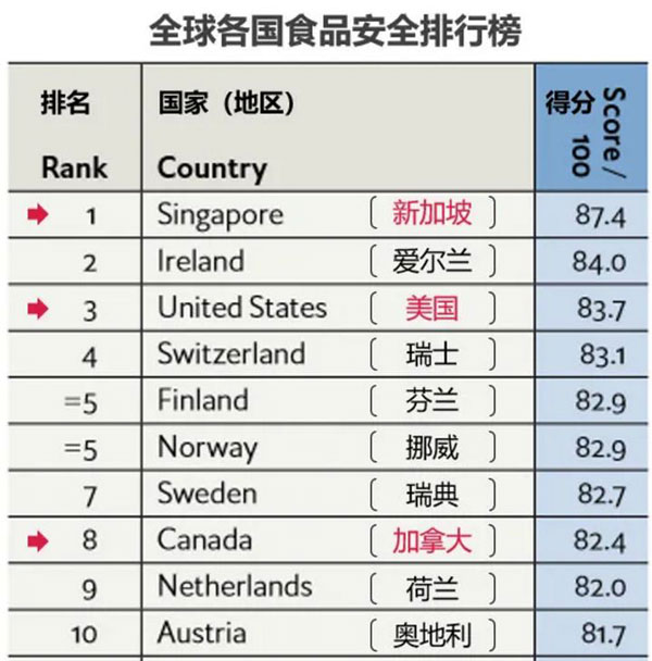 经济学人杂志发布的《2019全球食品安全指数报告》给出了2019年世界各国在食品安全方面的排名。新加坡以87.4的高分排在第1位,中国排在第35位;爱尔兰和美国排在2、3位,加拿大、澳大利亚分列第8、第12位。