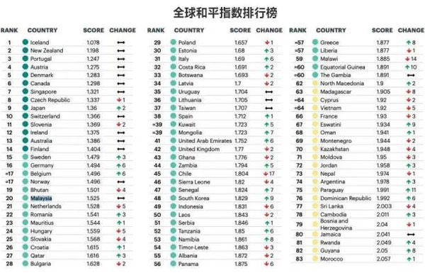 澳大利亚智库——经济与和平研究所新发布的《全球和平指数报告》提供了世界各国最新的和平指数排行榜。该研究综合了23个指标,包括境内外冲突、社会安保和军事信息等方面,将所有指标按照1-5的量化数据进行加权平均,最终得到全球163个国家和地区的和平指数。