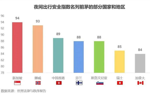 2018年美国民意调查公司发布的《全球法律与秩序报告》公布了全球142个国家(地区)的夜间出行安全指数排名。新加坡表现较佳,以94分的高分位居榜首,挪威和中国香港位列第2、3位。