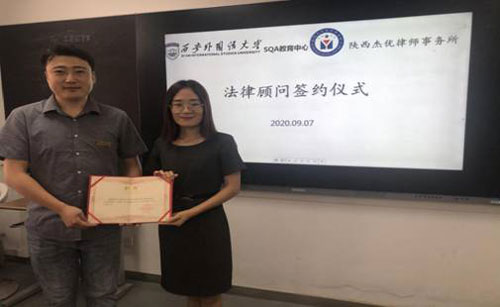 发布时间:04-28 来源:西安外国语大学SQA教育中心9月7日下午,为了大力弘扬法治精神,创建文明、和谐校园,普及法律意识,国际学院SQA教育中心给大一学生在2号教学楼举行了一场“开学第一课、法制进校园”为主题的普法讲座。本次讲座特邀请陕西杰优律师事务所主任陈小燕律师,就网络舆论、校园套路贷、校园恋情勿偏激、远离黄赌毒、校园安全等五个方面进行了全面讲解,并举行了法律顾问现场聘任仪式。SQA教育中心工作人员及2020级全体学生参加了本次讲座。本次讲座由辅导员刘晨主持。