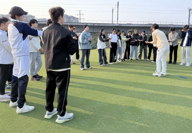 活动伊始,专业教练通过生动的讲解,带领同学们回溯了高尔夫运动的起源与发展历程,阐释了其“诚实、自律、尊重”的核心理念。通过互动问答与案例分享,同学们不仅了解了高尔夫在商务、社交等领域的独特价值,更深刻体会到这项运动对个人品格培养的积极意义。