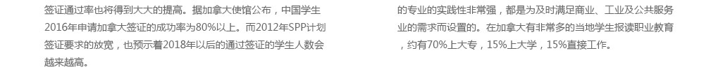 SPP计划英文全称 Student Partnership Program,即学生合作计划。这个计划是由加拿大社区大学协会(ACCC)和加拿大使馆联合推出的,此计划针对雅思成绩已经达到5.5的 学生,加拿大使馆放松对其资金的来源检查,取消对担保金必须提供12个月的存款历史的硬性规定。此举目的意在提高希望申请加拿大部分学院和新兴大学的学生签证成功率,吸引 更多国外学生来加拿大接受教育。目前,加拿大一共有44家院校参与了SPP计划,其中有5所是大学(包括:卡普顿大学、昆特兰理工大学、温哥华岛大学,菲莎河谷大学,和麦克文 大学)。这些参与的学校主要为当地规模大认可度高的学院或者新晋大学。而此类院校通常教学实用性强,并以就业为导向,学生毕业后更容易在当地找工作和移民。